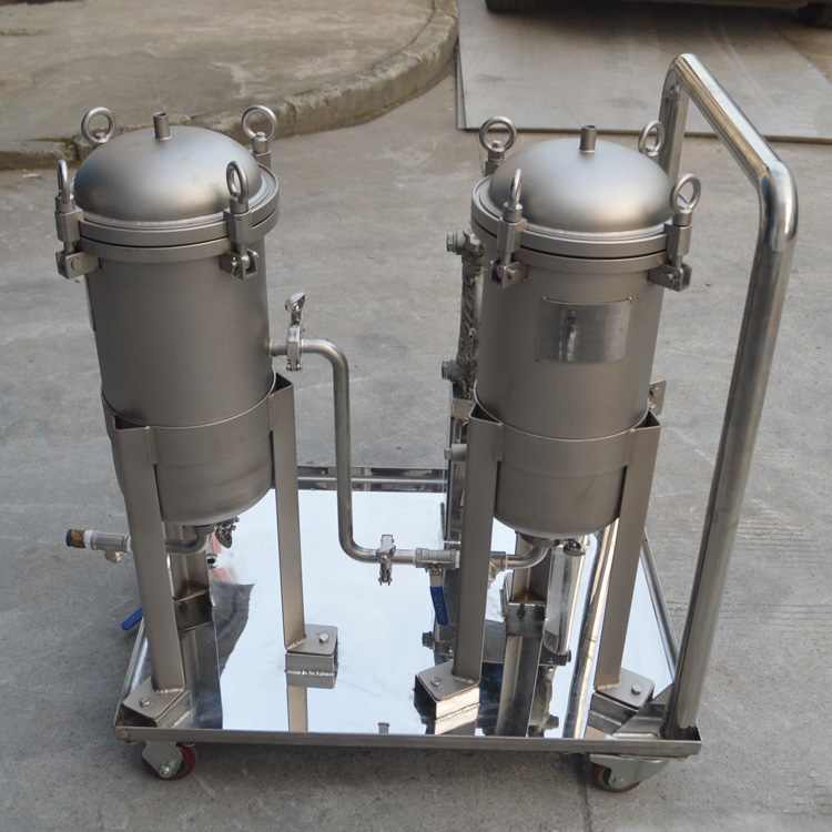 本設(shè)備全部采用不銹鋼SUS304/316L制造,濾筒內(nèi)裝有不銹鋼濾網(wǎng)和濾網(wǎng)支撐籃;頂部裝有放氣閥,供過濾時(shí)排放濾器內(nèi)空氣作用。上蓋與濾筒連接采用快開式結(jié)構(gòu),更方便清洗(更換)濾網(wǎng),三只可調(diào)節(jié)式支腳可使濾器平穩(wěn)放置在地面上。連接管路采用活接或卡箍連接方式,進(jìn)出料閥門采用三通球閥啟閉,操作靈活方便,無料液泄漏更衛(wèi)生。管道接頭采用脹合連接,經(jīng)0.3Mpa水壓試驗(yàn),三通外螺紋旋塞啟閉靈活,該設(shè)備結(jié)構(gòu)緊湊,操作方便,維修簡單。 此外:可將兩個(gè)單筒過濾器組裝在一個(gè)機(jī)座上,清洗過濾器時(shí)不必停車,保證其連續(xù)工作,適用于不停車生產(chǎn)線過濾裝置。